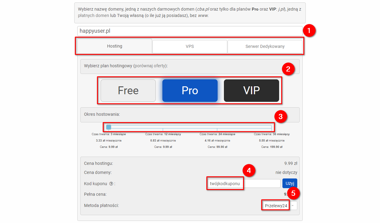 Wybierz usługę (1), plan hostingowy (2) i okres hostowania (3). Jeśli posiadasz kod kuponu, to możesz go wprowadzić (4). Sprawdź również nasze kanały w mediach społecznościowych, aby dowiedzieć się o najnowszych promocjach! Wybierz metodę płatności (5).
